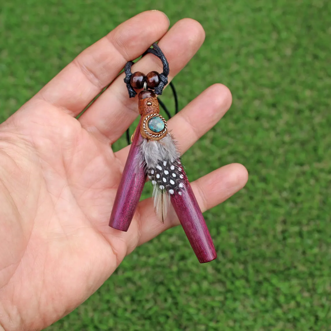 Necklace Kuripe Self Applicator | Made of Rose Wood | Decorated with Peruvian Turquoise, Domestic Feather and A piece of Aya Vine